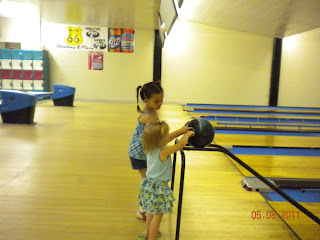 I had to spend the first 8 hours of my day at work, lucky me. After work I went home to put the finishing touches on the flower pots I had made as mother's day gifts, and Vicky brought Audrey to me. We were supposed to meet my in-law's at the bowling alley at 2, but considering I didn't even get off until 2:10 we were running a little late.
